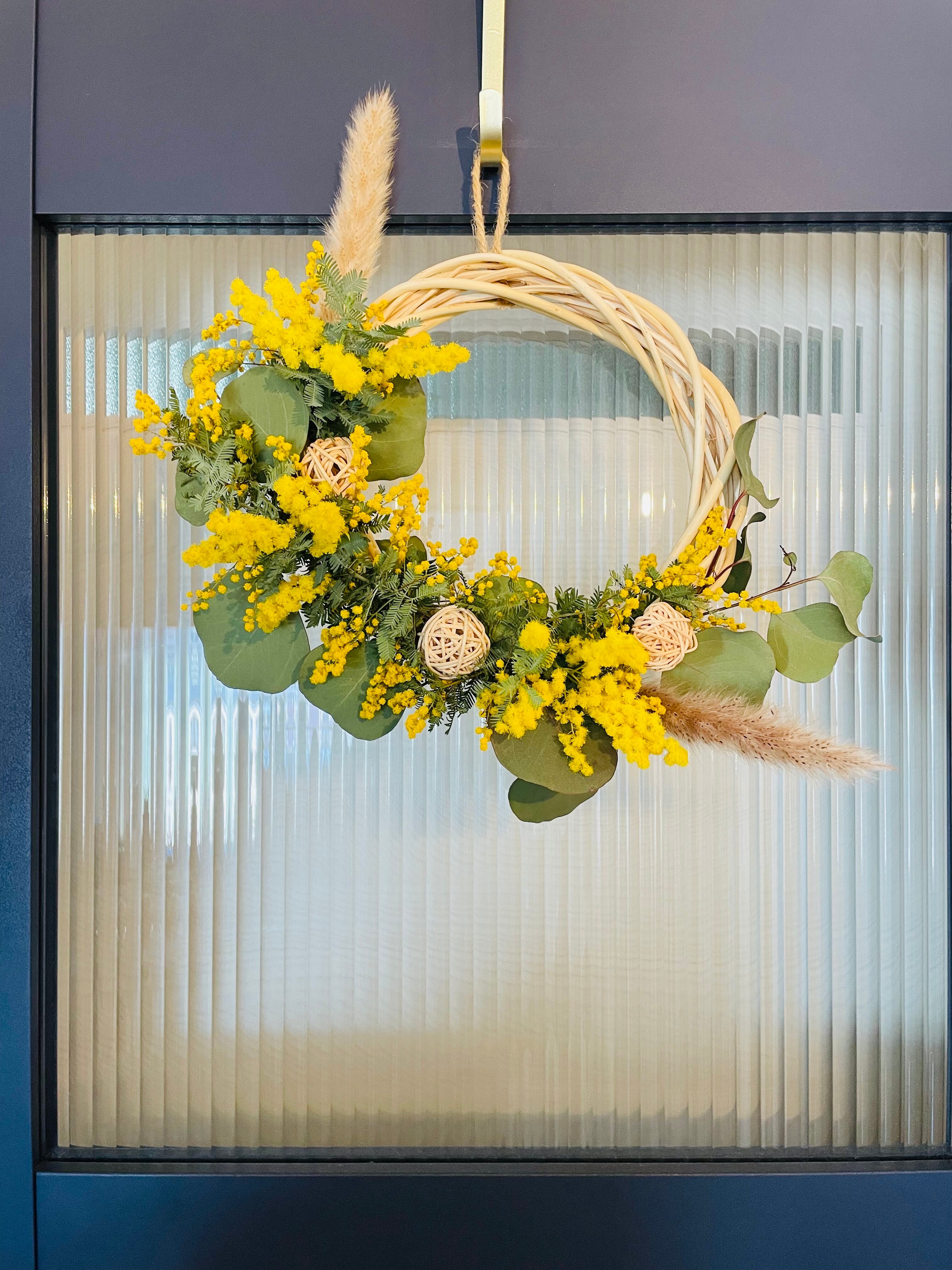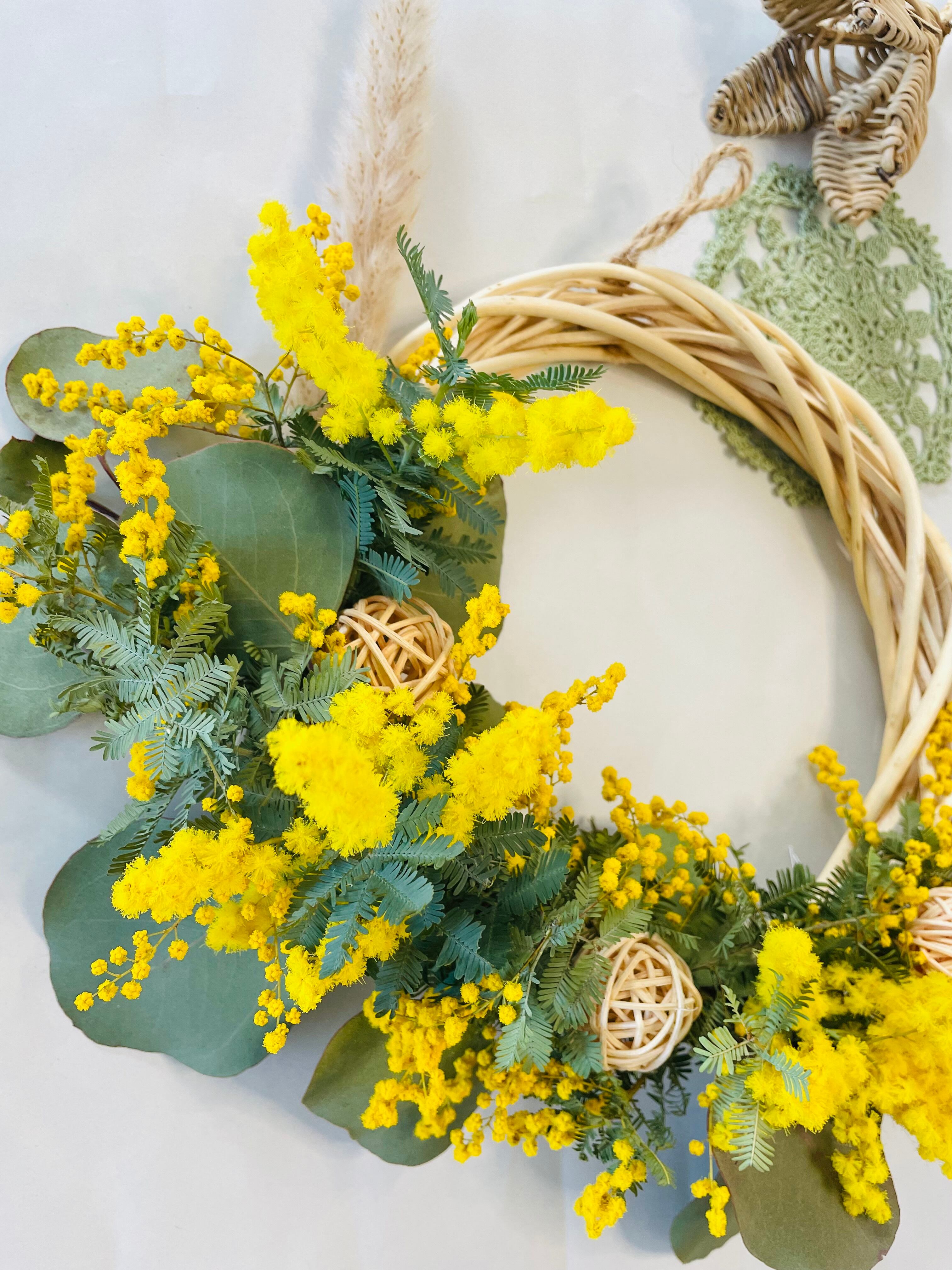 送料無料◎フレッシュミモザとユーカリの春リース⭐︎ラタン(籐)とパンパスを添えて⭐︎母の日 新築祝い 引越し祝い