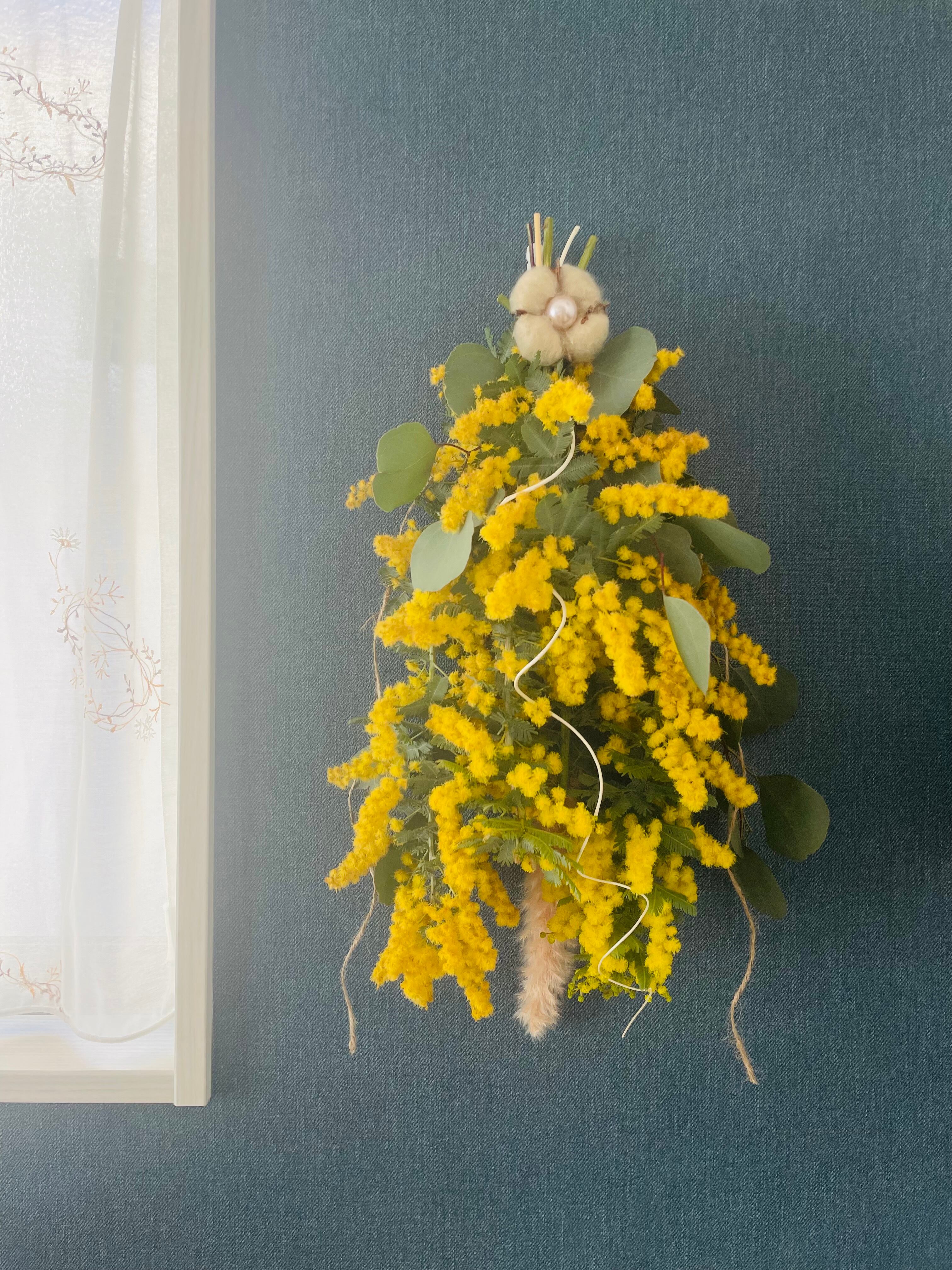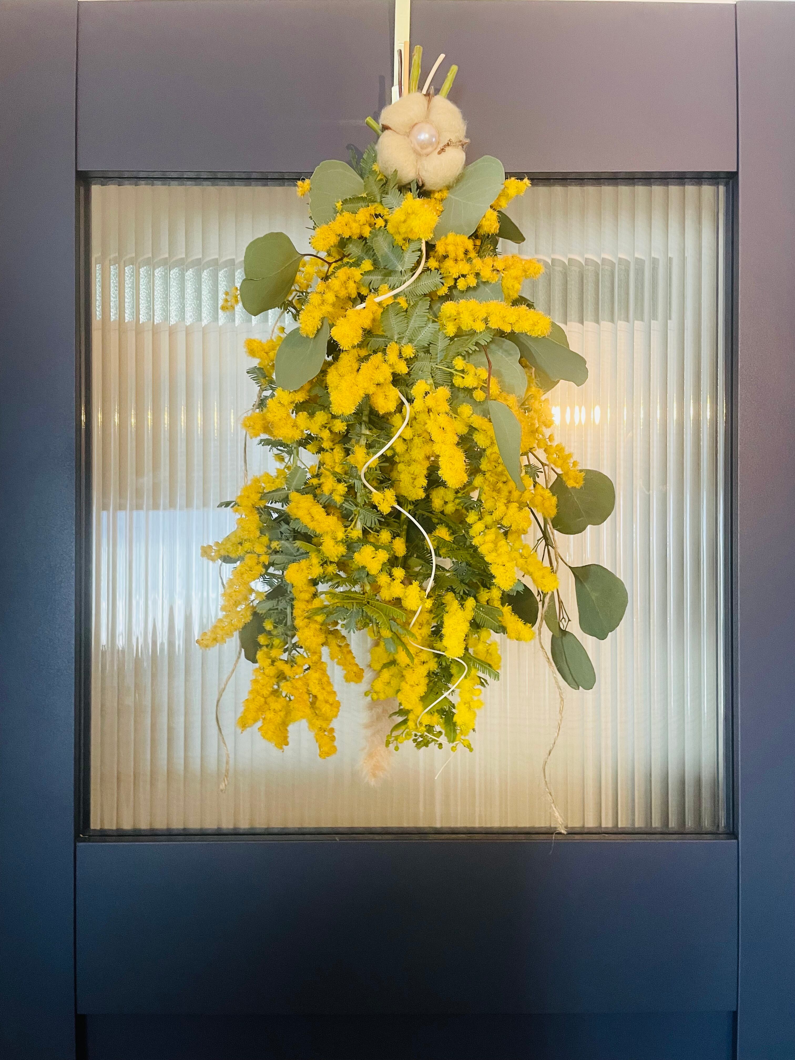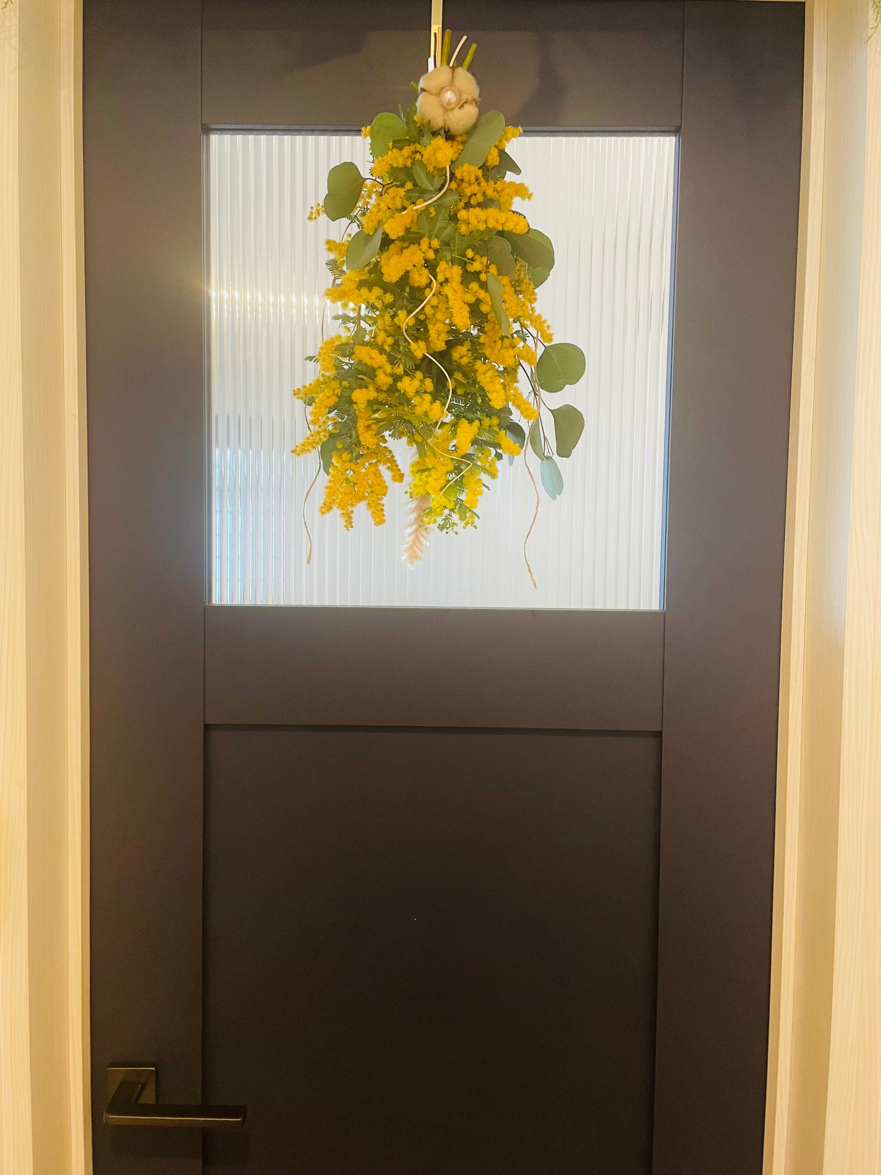 春、ミモザ、ユーカリ、パンパス、スワッグ、ドライフラワー、コットン、春スワッグ、ドアスワッグ、母の日、新築祝い、ギフト、誕生日、入学祝い、送料無料